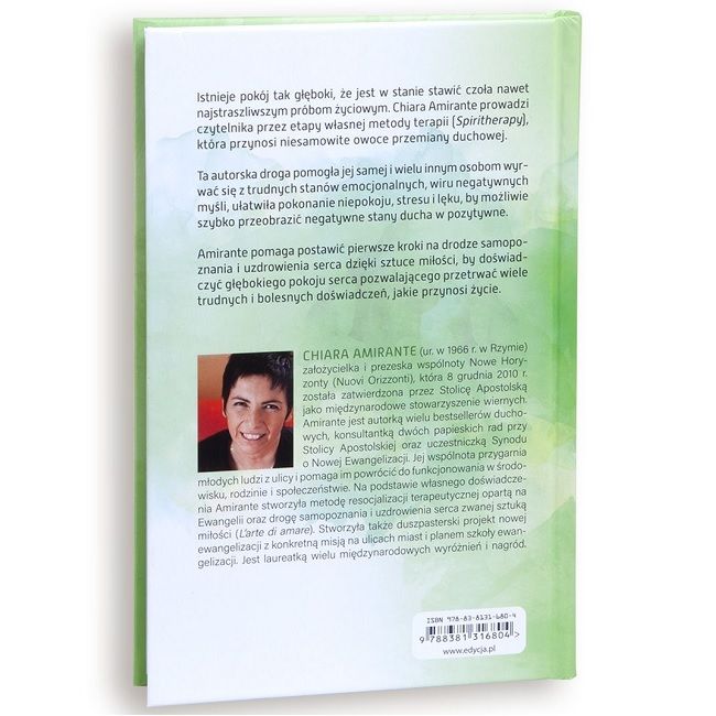 Autorka, książki, Chiara Amirante, prowadzi czytelnika przez etapy własnej metody terapii (Spiritherapy), która przynosi niesamowite owoce przemiany duchowej. To doskonały sposób, by postawić pierwsze kroki na drodze samopoznania i uzdrowienia serca dzięki sztuce miłości, by doświadczyć głębokiego pokoju serca pozwalającego przetrwać wiele trudnych i bolesnych doświadczeń, jakie przynosi życie.
